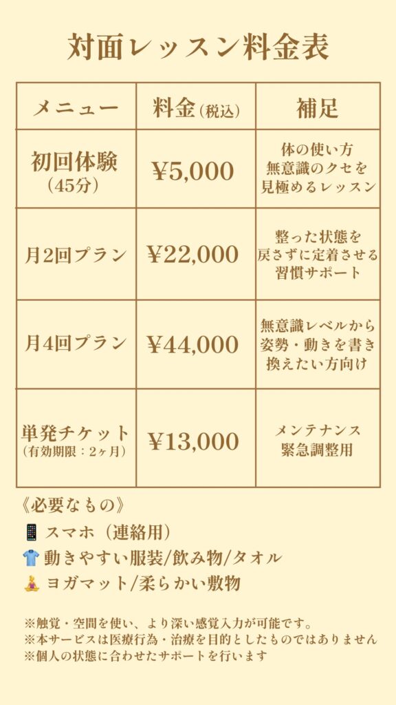 1対1でじっくり整える、暮らしに寄り添うパーソナルレッスンを意識しています。